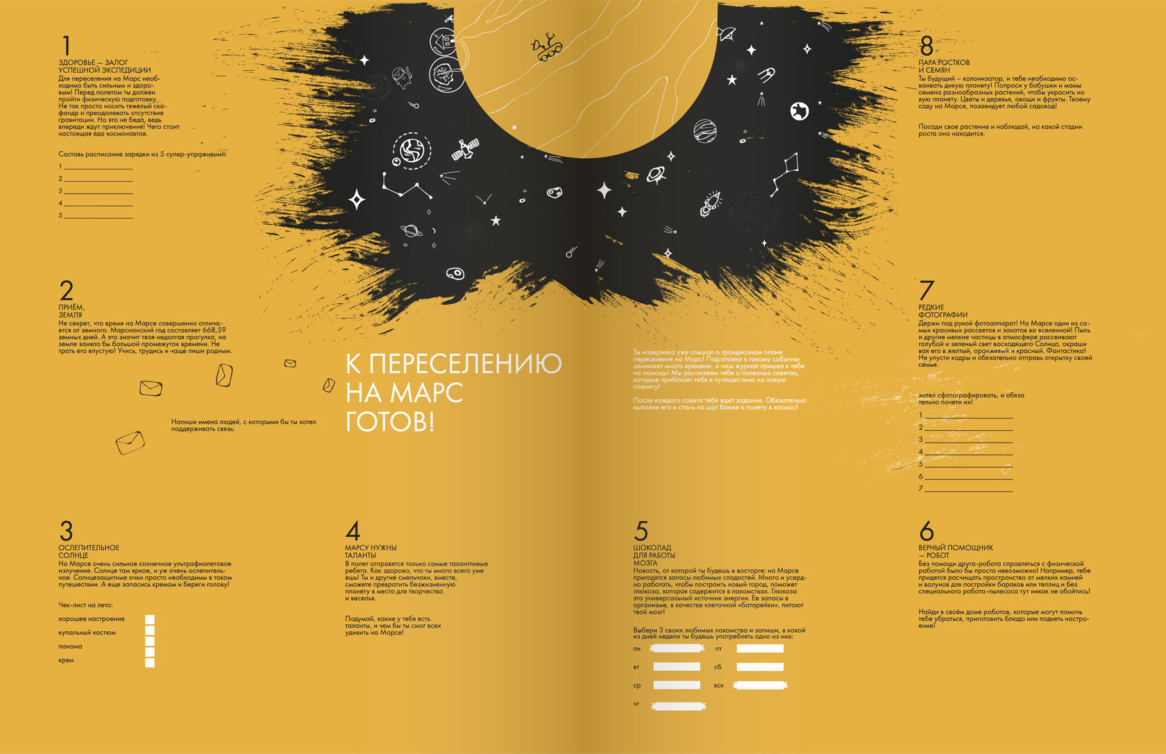Для разворота журнала необходимо было придумать и проиллюстрировать статью на тему "мистика". Я выбрала тему колонизации Марса. Чтобы адаптировать ее под детский журнал, я поразмышляла о том, какие могли бы быть привычки у детей на Марсе и как они могли бы пригодится ребятам на нашей планете...